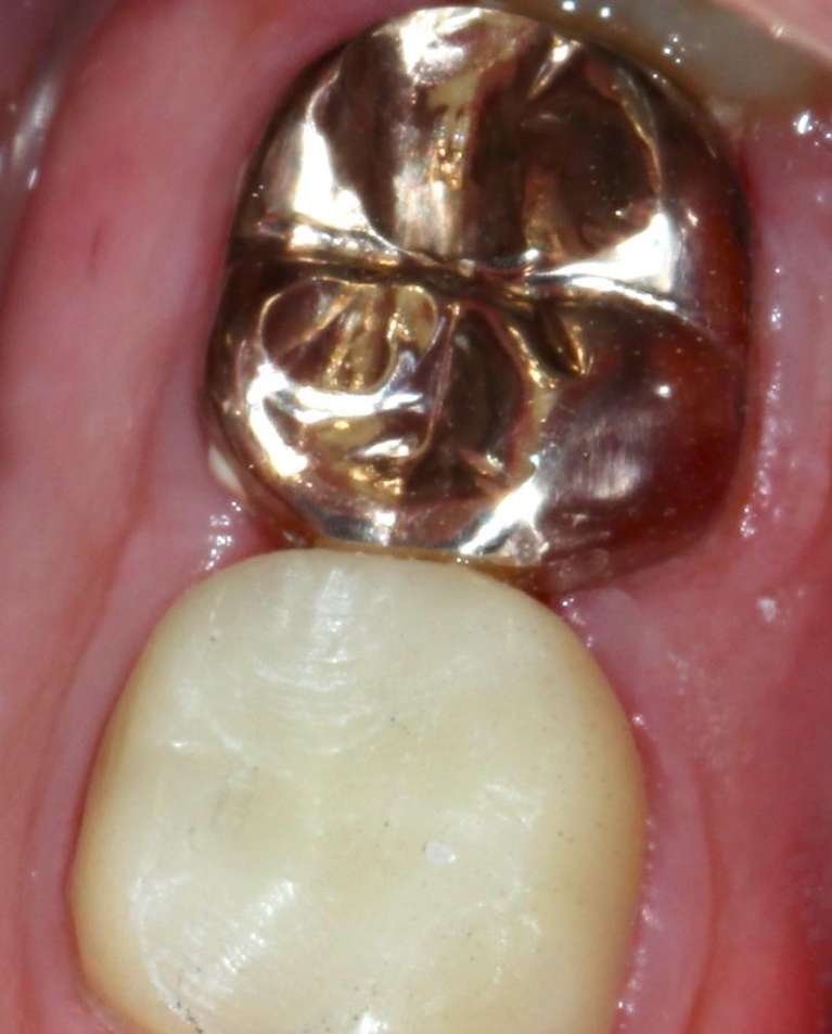 Older silver filling with recurrent decay and fractures within the walls of the existing tooth structure. A gold crown was used on the second molar as it is more better for the bite in the second molar position. A full porcelain crown was used for the first molar. The premolar has an old filling that failed which was replaced with a composite filling.