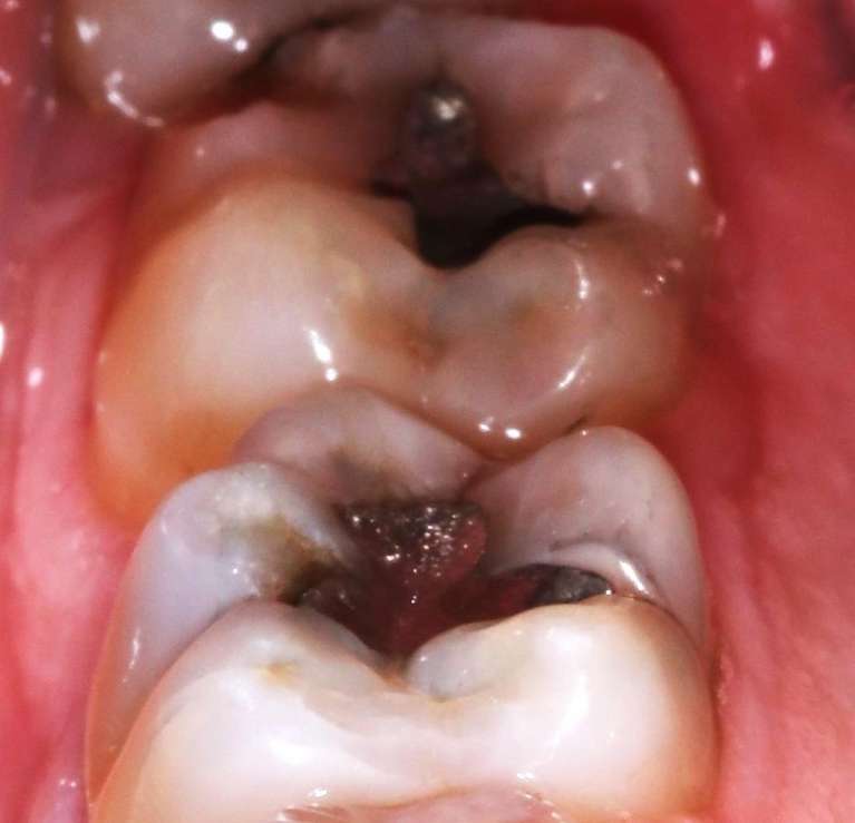 This patient presented with severely decayed molars. Chewing and eating were becoming increasingly difficult and uncomfortable for them.